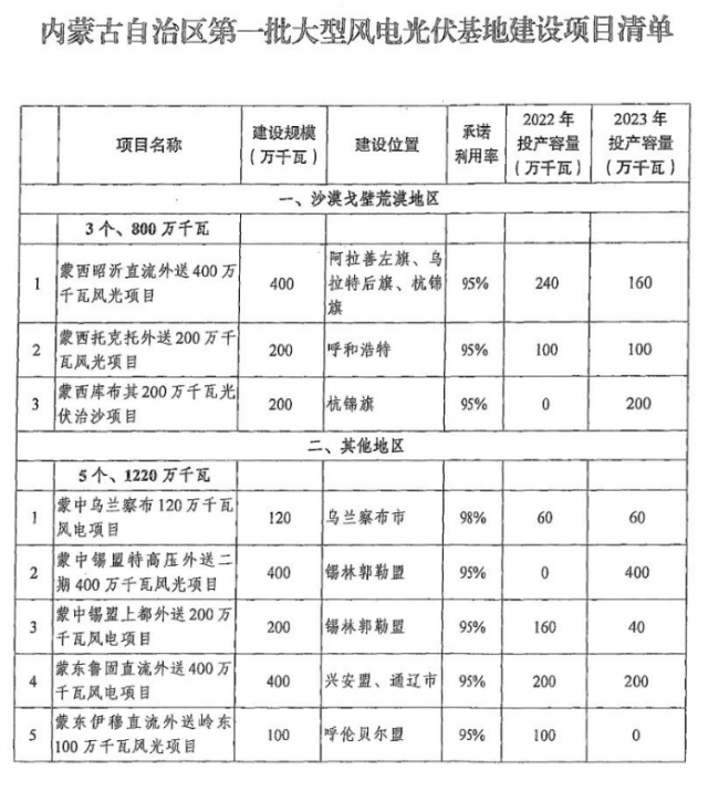 根據(jù)此前公開信息顯示,第一批風光大基地總規(guī)模約97.05GW(《總規(guī)模97.05GW!第一批大型風、光大基地項目名單發(fā)布》),主要布局在內蒙、青海、甘肅等19個省份,包括2GW魯北鹽堿灘基地、2.6GW廣西橫州基地、青海海南、海西10.9GW基地、陜五一期6GW外送基地、渭南3.53GW基地、內蒙古2GW光伏治沙……等等均已悉數(shù)開工。其中,內蒙古第一批8個國家大型風電光伏基地項目共計2020萬千瓦。