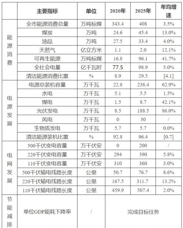 ——能源安全保障目標(biāo)。到2025年,電力裝機(jī)容量達(dá)238.4萬(wàn)千瓦,清潔能源裝機(jī)容量達(dá)229.7萬(wàn)千瓦,占電力總裝機(jī)容量的96.4%;新增110千伏以上輸電線路210公里以上,新增變電容量346萬(wàn)千伏安;完善城市天然氣管網(wǎng)建設(shè),新建江南門站、高中壓調(diào)壓站2座,新建次高壓管網(wǎng)16公里、中壓管網(wǎng)370公里以上。