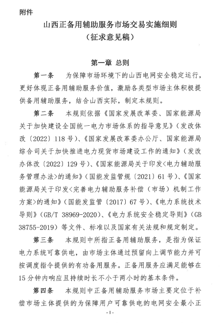 山西能監(jiān)辦發(fā)布山西正備用輔助服務(wù)市場(chǎng)交易實(shí)施細(xì)則(征求意見(jiàn)稿)