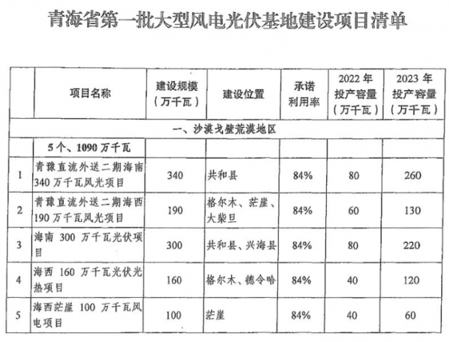 2022年8月24日,青海省能源局在“關(guān)于加強(qiáng)海南州清潔能源產(chǎn)業(yè)建設(shè)的建議”——省十三屆人民代表大會第七次會議第224014號建議答復(fù)的函上表示,省第二批大型風(fēng)電光伏基地取得重大進(jìn)展,7個項目、合計700萬千瓦納入第二批以沙漠、戈壁、荒漠地區(qū)為重點的大型風(fēng)電光伏基地建設(shè)項目清單,其中隆發(fā)共和100萬千瓦源網(wǎng)荷儲項目、中能建江蘇設(shè)計院/江蘇美科共和100萬千瓦源網(wǎng)荷儲項目、伏山共和100萬千瓦源網(wǎng)荷儲項目、中電建共和100萬千瓦光伏光熱項目共400萬落地海南州共和縣。