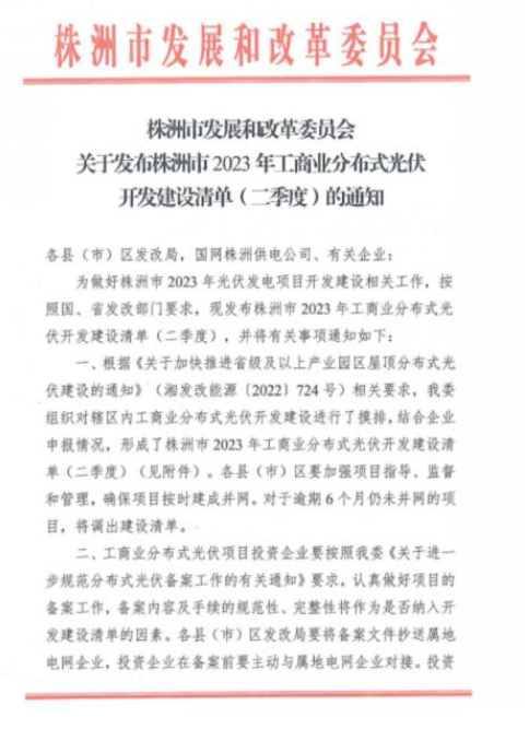 株洲市發(fā)改委要求,工商業(yè)分布式光伏項目投資企業(yè)要按照《關(guān)于進一步規(guī)范分布式光伏備案工作的有關(guān)通知》要求,認真做好項目的備案工作,備案內(nèi)容及手續(xù)的規(guī)范性、完整性將作為是否納入開發(fā)建設(shè)清單的因素。各縣(市)區(qū)發(fā)改局要將備案文件抄送屬地電網(wǎng)企業(yè),投資企業(yè)在備案前要主動與屬地電網(wǎng)企業(yè)對接。
