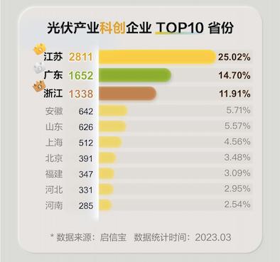 光伏產(chǎn)業(yè)技術(shù)迭代速度迅猛,屬于科技含量較高的成長性行業(yè),啟信寶產(chǎn)業(yè)鏈數(shù)據(jù)庫從企業(yè)技術(shù)創(chuàng)新、科創(chuàng)資質(zhì)、研發(fā)實力、企業(yè)成長性以及行業(yè)潛力5個維度對光伏企業(yè)進行科創(chuàng)能力“掃描”后發(fā)現(xiàn),光伏產(chǎn)業(yè)鏈中,科創(chuàng)企業(yè)主要集中在江蘇、廣東、浙江三省,三省的科創(chuàng)企業(yè)數(shù)量約為2800家、1600家、1300家左右,分別占比25.02%、14.70%以及11.91%。江蘇成“存續(xù)企業(yè)”“科創(chuàng)企業(yè)”數(shù)量雙料榜首。