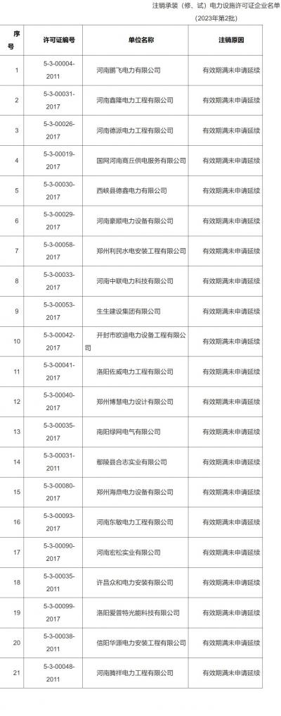根據(jù)《承裝(修、試)電力設施許可證注銷理辦法》(國家發(fā)展改革委2020年第36號令)第三十一條第(一)項和《承裝(修、試)電力設施許可證注銷管理辦法》(國能發(fā)資質規(guī)〔2021〕48號)第五條第(二)項規(guī)定,承裝(修、試)電力設施企業(yè)許可有效期屆滿未按照規(guī)定申請延續(xù)或者延續(xù)申請未批準的,應依法辦理許可證注銷手續(xù)。