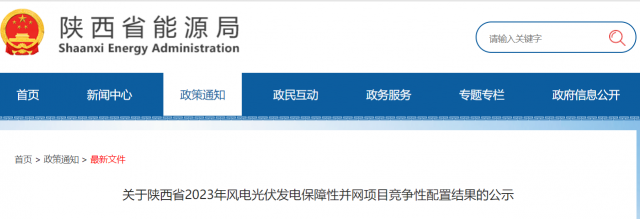 現(xiàn)將2023年陜西省風電、光伏發(fā)電保障性并網(wǎng)項目競爭性配置結(jié)果進行公示。公示時間為2023年8月25日至2023年8月31日,如有異議,請在公示期內(nèi)以書面實名反映。