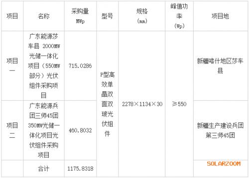 本次組件采購(gòu)包括廣東能源莎車縣2000MW光儲(chǔ)一體化項(xiàng)目(550MW部分)光伏組件采購(gòu)項(xiàng)目、廣東能源兵團(tuán)三師45團(tuán)350MW光儲(chǔ)一體化項(xiàng)目光伏組件采購(gòu)項(xiàng)目的單晶雙面雙玻太陽能光伏組件及配套組串引出線用接插件、備品備件、專用工具和技術(shù)服務(wù),具體數(shù)量及要求如下: