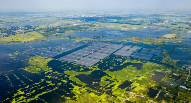 山東省濰坊市壽光市羊口鎮(zhèn)是百年曬鹽之地,這里的鹽堿地改良一直是個難題。國家電投壽光官臺營子150兆瓦漁光互補發(fā)電項目通過廢舊低效鹽田水產(chǎn)養(yǎng)殖與光伏發(fā)電相結合,在水面上方架設光伏板陣列、板下水域養(yǎng)殖魚蝦,實現(xiàn)了土地資源的節(jié)約集約高效利用。經(jīng)測算,該項目每年可提供清潔電能約2.52億千瓦時,替代標準煤7.7萬噸,減排二氧化碳21萬噸。