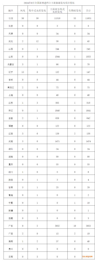 9月,全國新增建檔立卡新能源發(fā)電(不含戶用光伏)項(xiàng)目共11631個(gè),其中風(fēng)電項(xiàng)目36個(gè),光伏發(fā)電項(xiàng)目11560個(gè)(集中式光伏發(fā)電項(xiàng)目50個(gè),工商業(yè)分布式光伏發(fā)電項(xiàng)目11510個(gè)),生物質(zhì)發(fā)電項(xiàng)目35個(gè)。