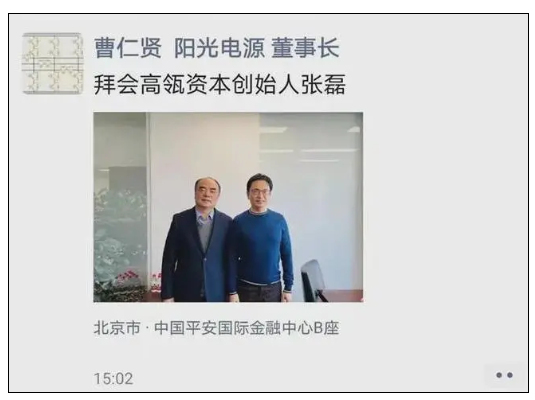 值得一提的是,在陽光電源發(fā)布定增預(yù)案之前的1月26日,陽光電源董事長曹仁賢的朋友圈里就發(fā)布了一張與張磊的合照,并配文“拜會高瓴資本創(chuàng)始人高磊”。這不僅引人遐想,高瓴會像入股隆基一樣,入股陽光電源么??