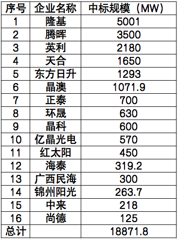 從定標(biāo)情況來看,由于部分央企采取的是框架招標(biāo),實(shí)際中標(biāo)人并未明確,在剔除此類招標(biāo)逾10GW后,明確中標(biāo)人的定標(biāo)規(guī)模約為19GW。其中,中標(biāo)規(guī)模TOP5依次為隆基、騰暉、英利、天合、東方日升;在一二線組件企業(yè)占比中,TOP6組件企業(yè)中標(biāo)規(guī)模總計(jì)為9.616GW,占明確中標(biāo)人總規(guī)模比重為51%。