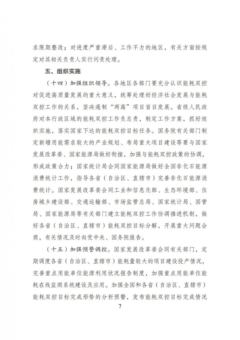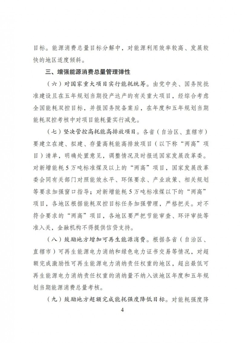 對新增能耗5萬噸標(biāo)準(zhǔn)煤及以上的“兩高”項目,國家發(fā)展改革委會同有關(guān)部門對照能效水平、環(huán)保要求、產(chǎn)業(yè)政策、相關(guān)規(guī)劃等要求加強窗口指導(dǎo);對新增能耗5萬噸標(biāo)準(zhǔn)煤以下的“兩高”項目,各地區(qū)根據(jù)能耗雙控目標(biāo)任務(wù)加強管理,嚴(yán)格把關(guān)。對不符合要求的“兩高”項目,各地區(qū)要嚴(yán)把節(jié)能審查、環(huán)評審批等準(zhǔn)入關(guān),金融機構(gòu)不得提供信貸支持。