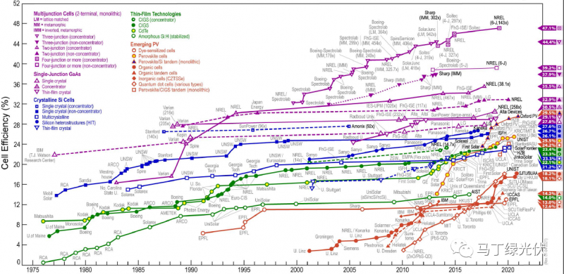 由鈣鈦礦電池和晶體硅組成的疊層電池理論轉(zhuǎn)換率極限可達43%。