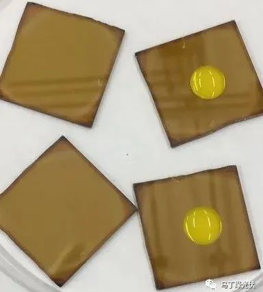 目前來看,鈣鈦礦材料對水汽或高溫較為敏感。直接暴露的高濕環(huán)境下,形成的鈣鈦礦結(jié)構(gòu)將會快速失效,變?yōu)榉氢}鈦礦結(jié)構(gòu),同時特有的棕褐色也會發(fā)生變化(如下圖,水滴滴在鈣鈦礦材料表面時,顏色發(fā)生了明顯的變化。所以,材料穩(wěn)定性與封裝的研究至關(guān)重要。在2021年初,杭州纖納重磅宣布了全球首個通過了基于IEC61215標(biāo)準(zhǔn)的加嚴穩(wěn)定性證書,邁出了鈣鈦礦組件商業(yè)化堅實的一步。
