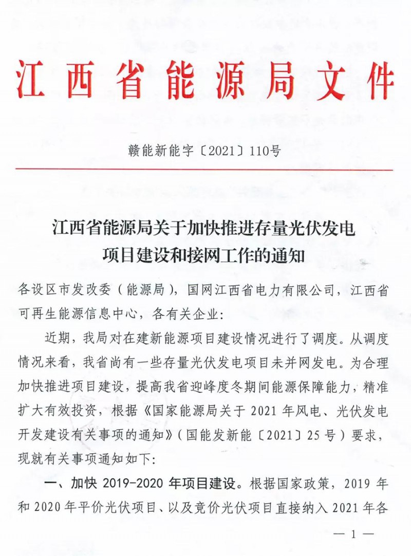 10月15日,江西省能源局發(fā)布《關于加快推進存量光伏發(fā)電項目建設和接網工作的通知》,通知要求:加快2019-2020年項目建設,江西省要求各項目單位在確保安全合規(guī)的前提下加快項目建設,逾期建成的將不予納入2021年保障性并網規(guī)模,并不予結轉。