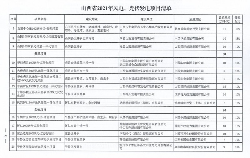 10月22日,山西省能源局下達(dá)2021年度風(fēng)電、光伏發(fā)電保障性并網(wǎng)年度建設(shè)計(jì)劃。風(fēng)、光合計(jì)17.792GW,其中保障性11.2GW+獎(jiǎng)勵(lì)700MW+備選5.892GW。文件明確保障性規(guī)模與獎(jiǎng)勵(lì)規(guī)模可同步開展前期工作,優(yōu)先保證保障性并網(wǎng)項(xiàng)目和獎(jiǎng)勵(lì)項(xiàng)目并網(wǎng),如上述項(xiàng)目未能按承諾時(shí)間并網(wǎng),將視項(xiàng)目成熟度、建設(shè)進(jìn)度和接入條件等,從備選項(xiàng)目中選擇并網(wǎng)項(xiàng)目,保障完成國(guó)家下達(dá)的最低消納責(zé)任權(quán)重。