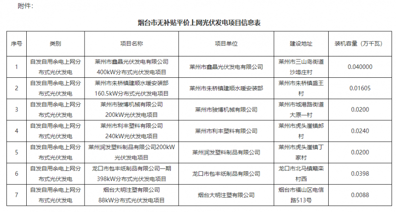 山東煙臺公示無補貼平價上網(wǎng)光伏發(fā)電項目信息