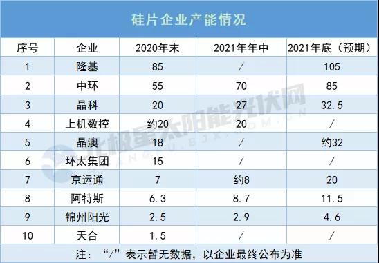 到2021年底,隆基預(yù)計(jì)單晶硅片產(chǎn)能將達(dá)105GW,中環(huán)則預(yù)期達(dá)85GW,兩者差距進(jìn)一步縮小。