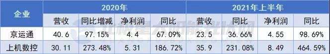 以鑄錠爐起家的京運(yùn)通從2017年開始主攻硅片業(yè)務(wù),截至2021年中,京運(yùn)通單晶硅片產(chǎn)能約8GW,另有12GW新增產(chǎn)能處于爬產(chǎn)期,預(yù)計(jì)2021年底產(chǎn)能達(dá)20GW;切割設(shè)備商上機(jī)數(shù)控從2019 年通過全資子公司弘元新材進(jìn)一步拓展單晶硅業(yè)務(wù),截至2021年中,實(shí)際產(chǎn)能20GW。2020年以及2021年上半年,京運(yùn)通、上機(jī)數(shù)控營收及凈利潤均實(shí)現(xiàn)了大幅增長,最高漲幅達(dá)464.59%,主要原因均指向硅片營收的大增。其中,上機(jī)數(shù)控2021年上半年?duì)I收及凈利潤均超過2020年全年。