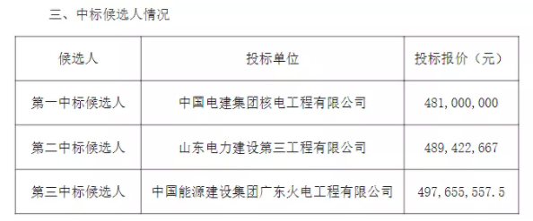 第一中標(biāo)候選人:中國電建集團(tuán)核電工程有限公司,投標(biāo)含稅總報價∶19762.307 萬元,折合3.85元/W。