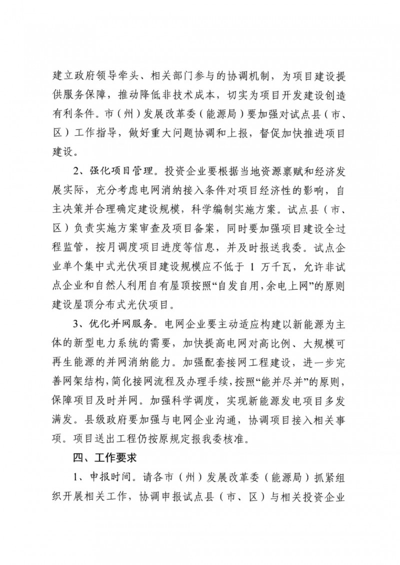 各市(州)應(yīng)根據(jù)資源稟賦情況合理申報(bào),資源富集區(qū)域申報(bào)數(shù)量不超過3個(gè),資源一般區(qū)域申報(bào)數(shù)量1-2個(gè)。于12月10日前將申報(bào)材料(含試點(diǎn)縣名單、投資企業(yè)、合作協(xié)議、初步方案等)報(bào)送發(fā)改委。