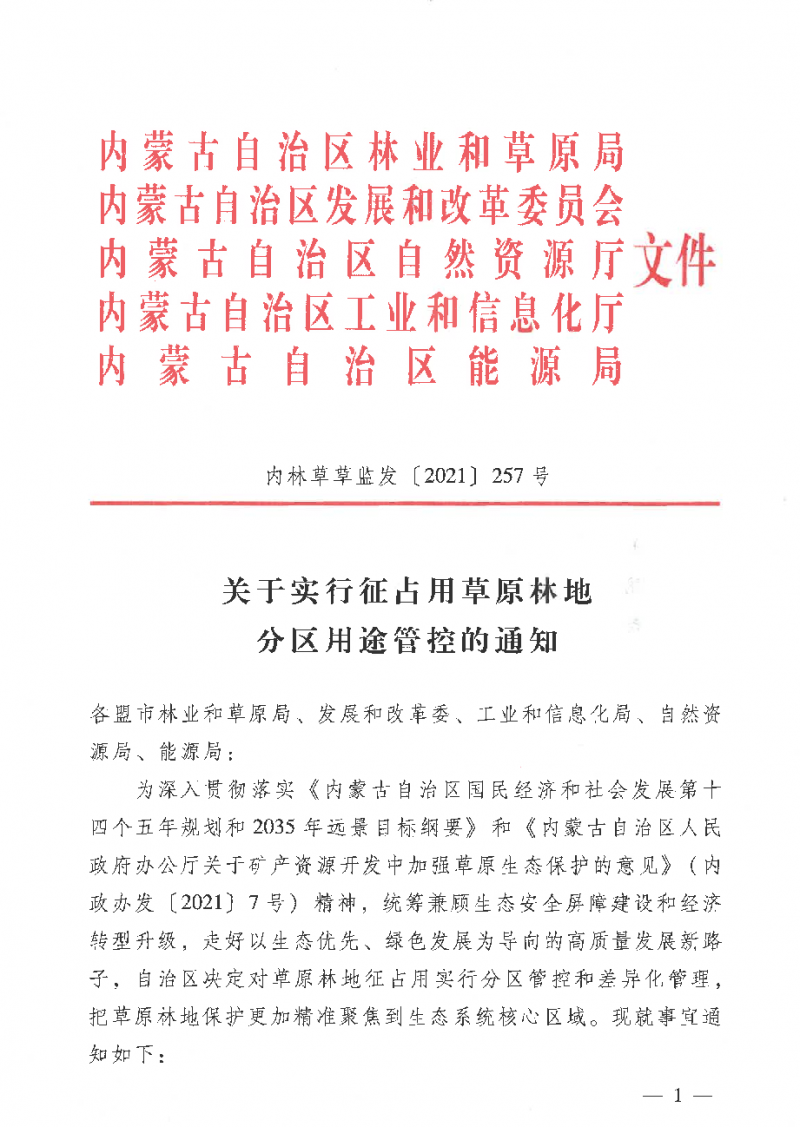 近日,內(nèi)蒙古自治區(qū)林業(yè)和草原局,內(nèi)蒙古自治區(qū)發(fā)展和改革委員會,內(nèi)蒙古自治區(qū)自然資源廳,內(nèi)蒙古自治區(qū)工業(yè)和信息化廳,內(nèi)蒙古自治區(qū)能源局聯(lián)合發(fā)布了《關(guān)于實行征占用草原林地分區(qū)用途管控的通知》,把草原林地保護更加精準聚焦到生態(tài)系統(tǒng)核心區(qū)域。文件顯示,內(nèi)蒙古將實行征占用草原林地分區(qū)用途管控。
