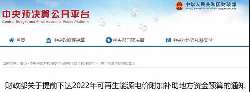 11 月 16日,中央預(yù)算公共平臺(tái)發(fā)布“關(guān)于提前下達(dá)2022年可再生能源電價(jià)附加補(bǔ)助地方資金預(yù)算的通知”。根據(jù)通知,本次下達(dá)總計(jì)新能源補(bǔ)貼資金38.7億元。其中,風(fēng)電15.5億元、光伏22.8億元、生物質(zhì)3824萬元。