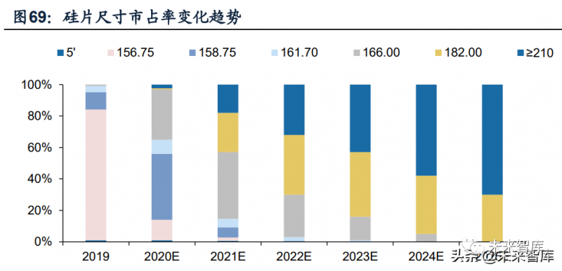 (1)背景:大尺寸化推動多環(huán)節(jié)降本,滲透提升成必然趨勢。在制造端,大尺寸硅片可以提升硅片、電池和組件產(chǎn)出量,從而攤薄單位生產(chǎn)成本;在組件端, 大尺寸硅片能夠有效提升組件功率,通過優(yōu)化電池和組件的設(shè)計提高組件效率,降低單瓦成本;在系統(tǒng)端,單片組件功率和轉(zhuǎn)換效率的提升可以減少支架及匯流箱等 固定成本。因此,大尺寸化能夠有效攤薄各環(huán)節(jié)加工及BOS成本,推動度電成本下降,大尺寸趨勢確定。據(jù)PV-Infolink預(yù)測,2020年硅片市場仍以158/166mm為 主,市占率為74%,但2021年時182/210mm尺寸硅片市占率將擴(kuò)大至18%,此后逐年上升。