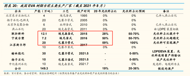 縱觀所有具備EVA產(chǎn)能的國內(nèi)企業(yè),能夠生產(chǎn)光伏級(jí)EVA的也只有斯?fàn)柊?、?lián)泓新科和寧波臺(tái)塑三家。榆林能化、揚(yáng)子石化、中化泉州石化均在2021年5-7月投產(chǎn)EVA材料,但暫未具備生產(chǎn)光伏級(jí)EVA的能力。