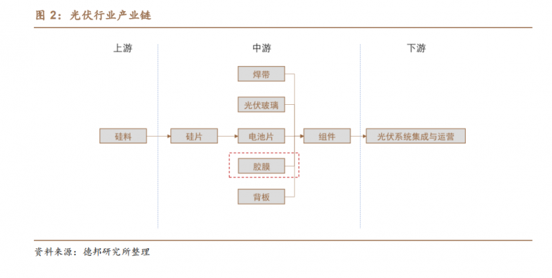 一套交付給電站的完整光伏組件包括:焊帶、光伏玻璃、電池片、膠膜、背板五部分。其中,電池片和光伏玻璃是成本占比較高的部分,膠膜的市場(chǎng)份額要小很多。
