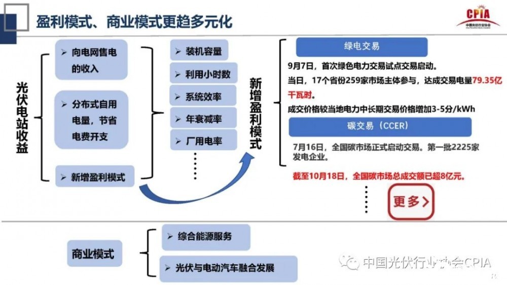 王勃華還指出,未來(lái)分布式光伏將迎來(lái)規(guī)模化發(fā)展的市場(chǎng)空間。究其原因是,第一,國(guó)家、地方政策的支持,以央企為梯隊(duì),地方國(guó)有企業(yè)和跨界能源巨頭企業(yè)為代表紛紛進(jìn)入分布式市場(chǎng)。第二,光伏盈利模式、商業(yè)模式的多元化。盈利上光伏電站收益新增綠電交易和碳交易(CCER)等盈利模式,商業(yè)模式方面是綜合能源服務(wù)和光伏與電動(dòng)汽車融合發(fā)展。