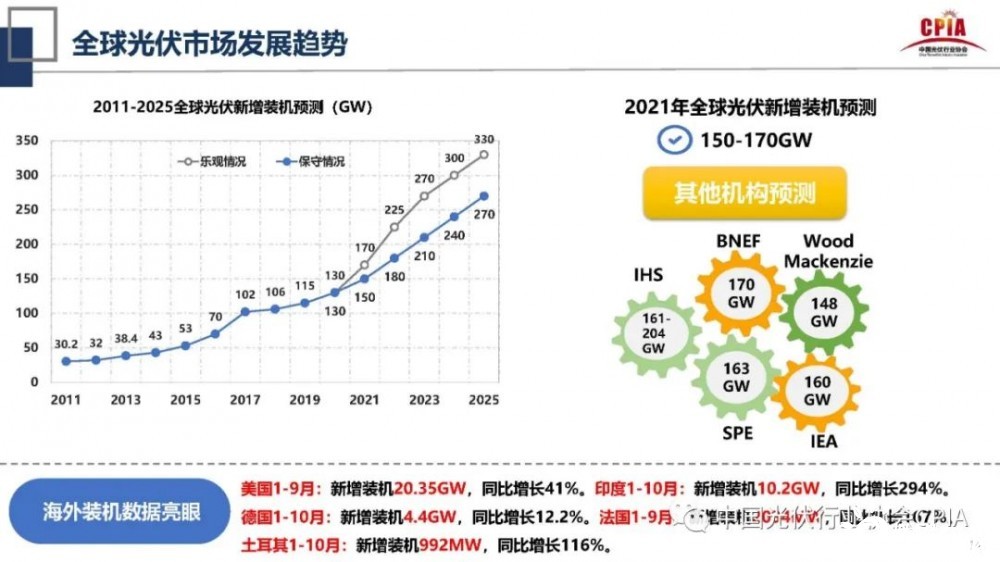 根據(jù)國(guó)際著名的研究機(jī)構(gòu)預(yù)測(cè),到2050年可再生能源發(fā)電量占比提升到90%,其中光伏和風(fēng)電占比63%,全球光伏裝機(jī)將超過(guò)14000GW。而在比較樂(lè)觀的情形下,2021-2026年光伏新增裝機(jī)將從160GW增到260GW,6年間光伏累計(jì)新增裝機(jī)量占可再生能源累計(jì)新增裝機(jī)量的60%。2021年全球光伏新增裝機(jī)預(yù)測(cè)達(dá)150-170GW。