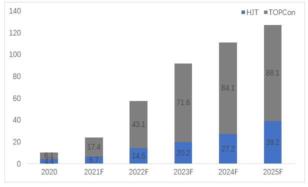 與P型電池相比,N型電池?fù)碛修D(zhuǎn)換效率高、溫度系數(shù)低、光衰減系數(shù)低、弱光響應(yīng)等綜合優(yōu)勢(shì),不僅BOS成本更低,N型電池在全生命周期內(nèi)的發(fā)電量也高于P型。根據(jù)各主流廠商擴(kuò)產(chǎn)計(jì)劃,2022年N型電池?cái)U(kuò)產(chǎn)規(guī)劃或達(dá)到40-50GW,實(shí)現(xiàn)規(guī)?;慨a(chǎn)。