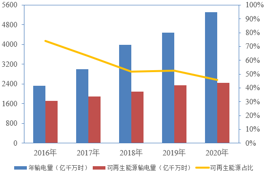 “十三五”期間,我國特高壓工程建設進展迅速,特高壓線路輸送電量和輸送可再生能源電量逐年增加,“西電東送”工程穩(wěn)步向前,但輸送可再生能源電量的比重反而在下降,2020年我國22條特高壓輸送通道平均可再生能源占比為46%,創(chuàng)下近五年新低。2021年10月24日,國務院印發(fā)的《2030年前碳達峰行動方案》提出“嚴控跨區(qū)外送可再生能源電力配套煤電規(guī)模,新建通道可再生能源電量比例原則上不低于50%。”可以預見,隨著全社會對碳達峰、碳中和目標形成共識以及國家政策引導,清潔能源占比將持續(xù)提升。