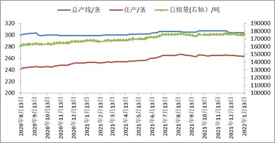 供應方面,截至1月13日,全國浮法玻璃生產(chǎn)線共計304條,在產(chǎn)264條,日熔量共計175225噸,環(huán)比前一周增加400噸/日。周內(nèi)生產(chǎn)線點火1條,冷修1條,改產(chǎn)1條。漳州旗濱玻璃有限公司800噸/日四線冷修完成,1月11日點火復產(chǎn)。重慶市賽德化工有限公司400噸/日一線窯爐到期,1月10日放水冷修。滕州金晶玻璃有限公司800噸/日四線原產(chǎn)白玻,1月10日投料改產(chǎn)超白。后期湖北明弘700噸/日生產(chǎn)線計劃20日冷修;本溪玉晶一條800噸/日生產(chǎn)線計劃復產(chǎn),一條700噸/日生產(chǎn)線計劃停產(chǎn)。光伏玻璃方面,深圳南玻一條600噸/日計劃本月末前冷修放水,福萊特一條600噸/日生產(chǎn)線計劃點火。玻璃生產(chǎn)利潤尚可,玻璃企業(yè)冷修計劃或有所延后。