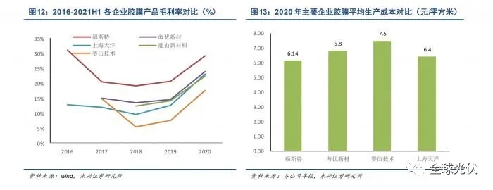 東興證券認(rèn)為,上游粒子廠商陸續(xù)投產(chǎn),光伏級(jí)粒子供給瓶頸將得到緩解,2021年原料成本端大幅上漲的壓力大概率不會(huì)延續(xù)到2022年,光伏膠膜成本有望得到進(jìn)一步控制和降低。與此同時(shí),受益光伏裝機(jī)需求增長(zhǎng),預(yù)計(jì)膠膜售價(jià)有望持續(xù)堅(jiān)挺。對(duì)于相關(guān)標(biāo)的來說,相較2021年,今年膠膜生產(chǎn)企業(yè)將會(huì)展現(xiàn)成本優(yōu)勢(shì),毛利率有望大幅上漲。綜合來看,膠膜行業(yè)議價(jià)能力和盈利能力都將有提升和改善。