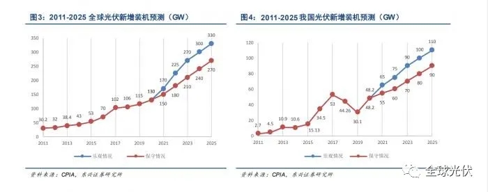 目前,全球已有130多個(gè)國(guó)家和地區(qū)相繼宣布碳中和目標(biāo),在全球提升可再生能源消費(fèi)比重的大背景下,全球新增風(fēng)光裝機(jī)將持續(xù)快速增長(zhǎng)。根據(jù)光伏年度大會(huì)理事長(zhǎng)王勃華預(yù)期,預(yù)計(jì)2021年全球光伏新增裝機(jī)量為150-170GW,并在未來幾年繼續(xù)保持年均30-40GW的增長(zhǎng),預(yù)計(jì)2025年新增全球裝機(jī)量將達(dá)270-330GW,新增裝機(jī)復(fù)合增速約17%。