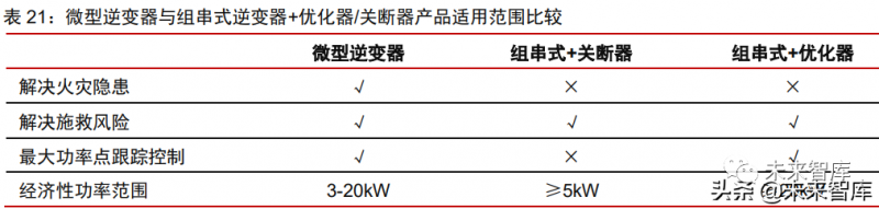 微型逆變器是小型、組件級分布式發(fā)電系統(tǒng)電能轉(zhuǎn)換的最佳方案。“組件級電力電子” 解決方案除了包括微型逆變器,還有“組串式逆變器+優(yōu)化器/關斷器”的方案。優(yōu)化器或 關斷器可為光伏系統(tǒng)提供組件級的關斷能力,在特定場景下保證光伏系統(tǒng)直流電壓不超過 80V,且優(yōu)化器亦可實現(xiàn)組件級的最大功率點跟蹤控制;但在運行過程中系統(tǒng)仍存在直流 高壓,有一定的安全隱患。組串式逆變器+優(yōu)化器/關斷器在較大功率的應用場景中有一定 的成本優(yōu)勢,但微型逆變器在中小功率等級的應用場景中更優(yōu)。