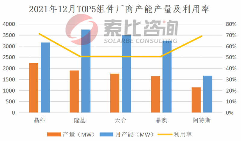 2021年12月,終端需求小幅上升,因此本月組件產(chǎn)量比上月也有小幅上漲。國內(nèi)組件產(chǎn)量16GW,環(huán)比增長2.23%。按照產(chǎn)量排名,晶科、隆基、天合、晶澳、阿特斯位列前五,企業(yè)總產(chǎn)量8.72GW,占比54.5%,綜合開工率58.41%。預(yù)計2022年1月,終端需求持續(xù)回暖,國內(nèi)2022年各企業(yè)集采招標已陸續(xù)啟動,組件需求及價格都將小幅上漲。