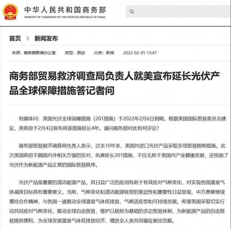 原標(biāo)題:中國(guó)商務(wù)部:美國(guó)扭曲了光伏產(chǎn)品正常的國(guó)際貿(mào)易秩序