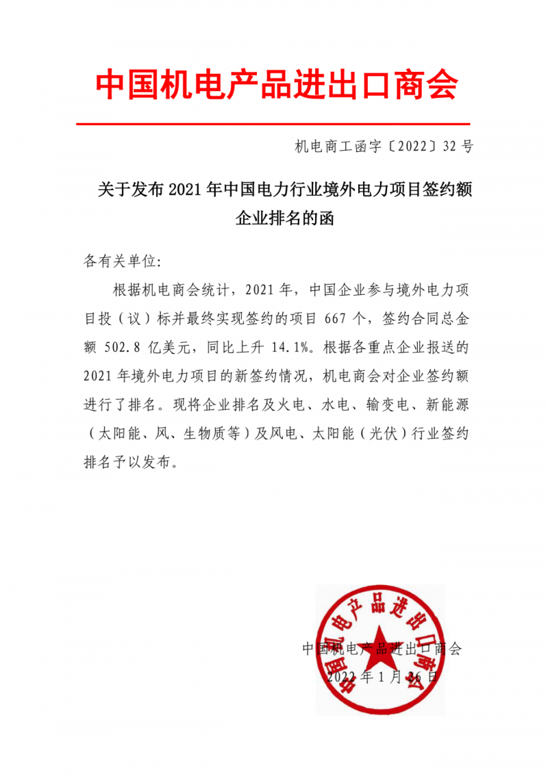 1月26日,中國(guó)機(jī)電產(chǎn)品進(jìn)出口商會(huì)發(fā)布中國(guó)企業(yè)參與境外電力項(xiàng)目投(議)標(biāo)并最終實(shí)現(xiàn)簽約的項(xiàng)目667個(gè),簽約合同總金額502.8億美元,同比上升14.1%。并對(duì)火電、水電、輸變電、新能源(太陽(yáng)能、風(fēng)、生物質(zhì)等)及風(fēng)電、太陽(yáng)能(光伏)行業(yè)簽約額進(jìn)行了排名。