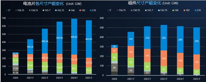 根據(jù)PVinfolink預(yù)測,210組件將逐步成為市場的主流技術(shù),2022年 210尺寸電池及組件產(chǎn)能分別達到306GW/234GW。