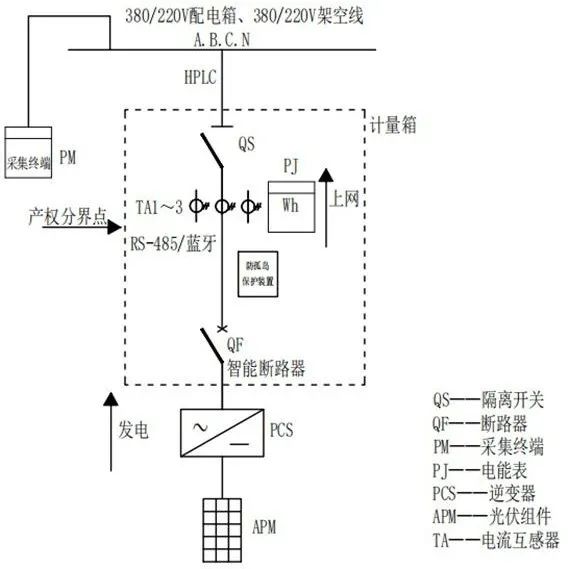 要實(shí)現(xiàn)上述目標(biāo),低壓分布式光伏計(jì)量采集需要安裝的主要設(shè)備包括:采集終端、智能電能表、電流互感器、智能斷路器、防/反孤島保護(hù)裝置等