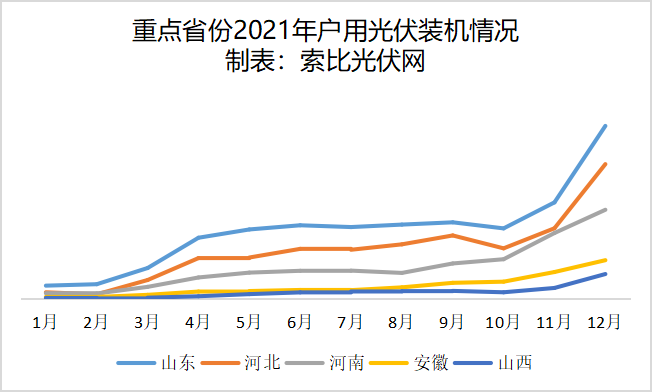 從2021年各省戶用光伏裝機(jī)規(guī)??矗綎|、河北、河南依然是最核心的三個主力市場,安徽、山西、江西、福建、江蘇等5個省也實現(xiàn)了裝機(jī)超400MW、占比超2%的目標(biāo)。