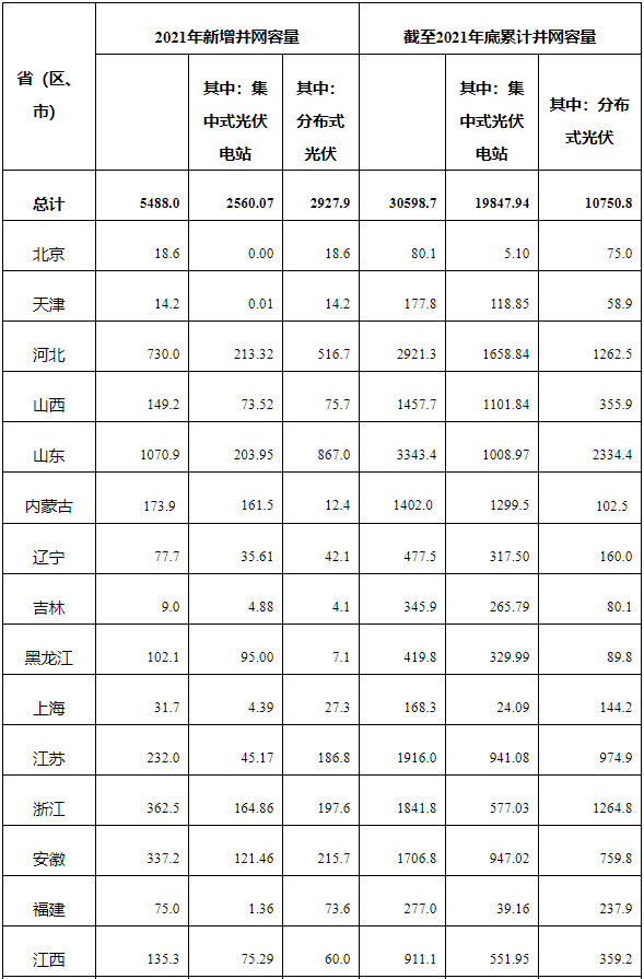 國家能源局公布2021年光伏發(fā)電建設運行情況,2021年我國光伏發(fā)電新增并網容量54.88GW,其中集中式光伏電站新增25.6007GW、分布式光伏電站29.279GW。