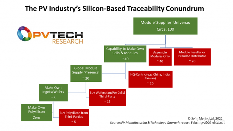這里的比例大約是20:40:40。這意味著,今天有大約40家公司可以提供組件,其中的關(guān)鍵部件(太陽能電池)也是由同一家公司制造的(要么在同一制造廠,要么在不同的地點(diǎn)/地區(qū)/國家)。