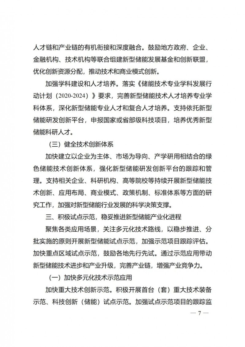 二是強化示范引領帶動產業(yè)發(fā)展?!秾嵤┓桨浮肪劢剐滦蛢δ芏嘣夹g路線、不同時間尺度技術和各類應用場景,以穩(wěn)步推進、分批實施的原則推動先進儲能技術試點示范,加快首臺(套)重大技術裝備等重點技術的創(chuàng)新示范,以工程實踐加速技術迭代和更新,促進成本下降;推動重點區(qū)域開展區(qū)域性儲能示范區(qū)建設,結合應用場景積極推動制定差異化政策,在一些創(chuàng)新成果多、體制基礎好、改革走在前的地區(qū)實現(xiàn)重點突破。結合新型儲能處于商業(yè)化初期階段實際,《實施方案》鼓勵各地在新型儲能發(fā)展工作中,堅持“示范先行”原則,避免“一刀切”上規(guī)模,積極開展技術創(chuàng)新、健全市場體系和政策機制方面的試點示范。通過示范應用帶動技術進步和產業(yè)升級,推動完善儲能上下游產業(yè)鏈條,支持儲能高新技術產業(yè)基地建設。