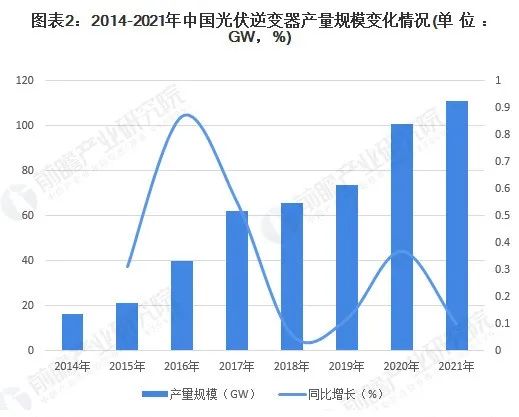 隨著國(guó)內(nèi)外光伏發(fā)電行業(yè)的快速發(fā)展,中國(guó)光伏逆變器產(chǎn)量由2014年的16.3GW增加至2020年超過100GW,年均復(fù)合增速超過35%。2021年,全國(guó)光伏發(fā)電新增裝機(jī)同比增長(zhǎng)了10%,國(guó)內(nèi)企業(yè)也加大光伏逆變器生產(chǎn)布局,帶動(dòng)光伏逆變器產(chǎn)量進(jìn)一步增長(zhǎng)。
