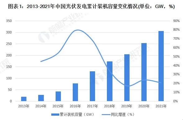 據(jù)國(guó)家能源局統(tǒng)計(jì)數(shù)據(jù)顯示,2013年以來,我國(guó)光伏發(fā)電累計(jì)裝機(jī)容量增長(zhǎng)迅速。2013年,全國(guó)光伏發(fā)電累計(jì)裝機(jī)容量?jī)H為19.42GW,到2021年累計(jì)突破300GW,連續(xù)7年穩(wěn)居全球首位。