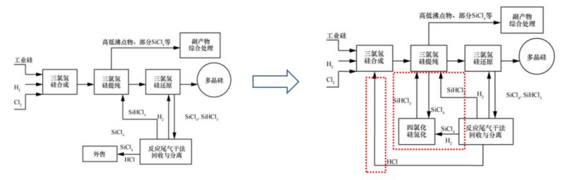 由于改良西門(mén)子法生成的副產(chǎn)物和尾氣較多,影響到生產(chǎn)成本。如何有效循環(huán)和處理產(chǎn)物關(guān)系到未來(lái)的降本方向。比如西門(mén)子法生產(chǎn)過(guò)程中會(huì)產(chǎn)生大量的副產(chǎn)物SiCl4,將SiCl4轉(zhuǎn)化成作為多晶硅生產(chǎn)原料的SiHCl3,從而實(shí)現(xiàn)閉環(huán)生產(chǎn),以提高硅粉利用率,降低生產(chǎn)成本。