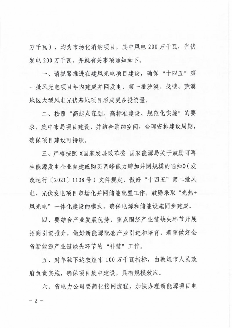 4月6日,甘肅省發(fā)展和改革委員會(huì)下發(fā)《關(guān)于下達(dá)酒泉市“十四五”第二批風(fēng)電、光伏發(fā)電項(xiàng)目建設(shè)指標(biāo)的通知》(甘發(fā)改能源〔2022)196號(hào))?!锻ㄖ诽岢鼍迫?quot;十四五"第二批風(fēng)電、光伏發(fā)電項(xiàng)目指標(biāo)為400萬(wàn)千瓦,實(shí)施時(shí)間為2023-2024年(包括專項(xiàng)安排敦煌市100萬(wàn)千瓦),均為市場(chǎng)化消納項(xiàng)目,其中風(fēng)電200萬(wàn)千瓦,光伏發(fā)電200萬(wàn)千萬(wàn)。