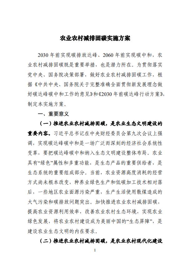 為貫徹落實碳達(dá)峰碳中和重大決策部署,推進(jìn)農(nóng)業(yè)農(nóng)村綠色低碳發(fā)展,我們制定了《農(nóng)業(yè)農(nóng)村減排固碳實施方案》,現(xiàn)印發(fā)你們,請結(jié)合實際貫徹落實。